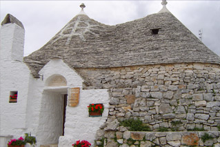 アルベロベッロで :世界遺産のアルベロベッロ市内半日観光 この童話の世界のような白と黒の円錐形の住居集落は世界遺産です。円錐形の屋根をのせた白壁のかわいい家で、この地方独特のもの。今ではトルッリの商店やトルッリのホテルや教会も出来ました。トルッリの中を見学することも出来ます。